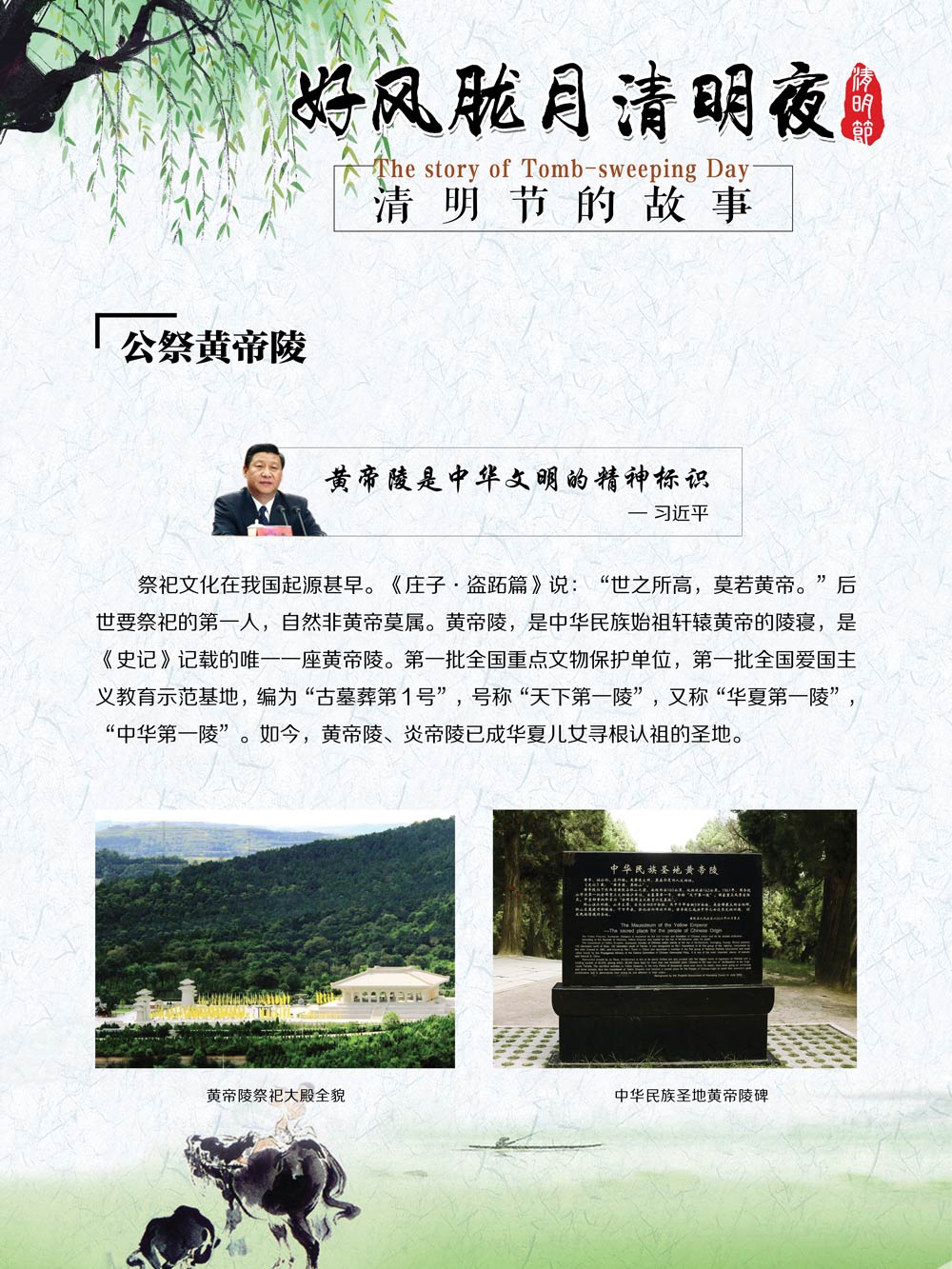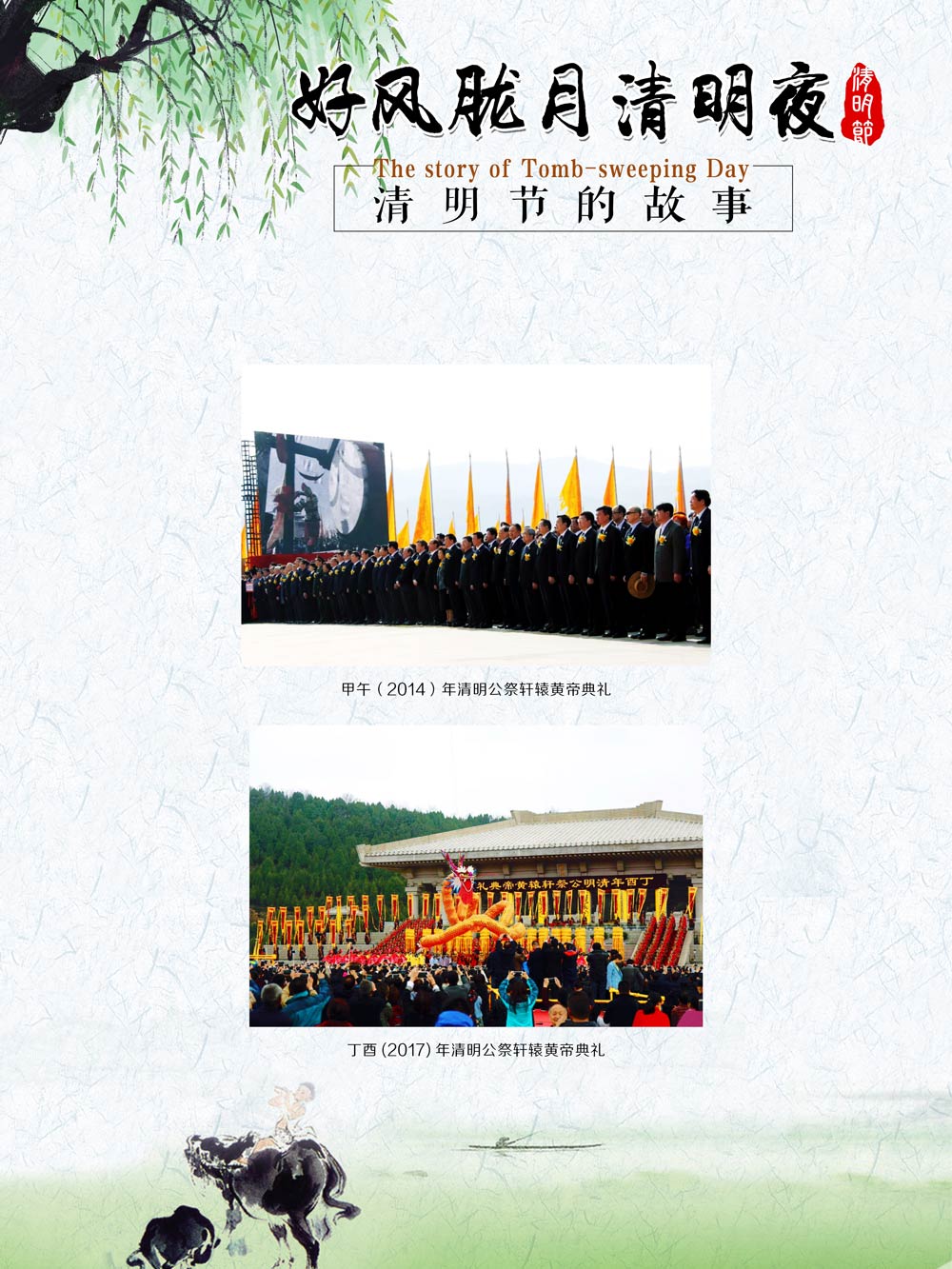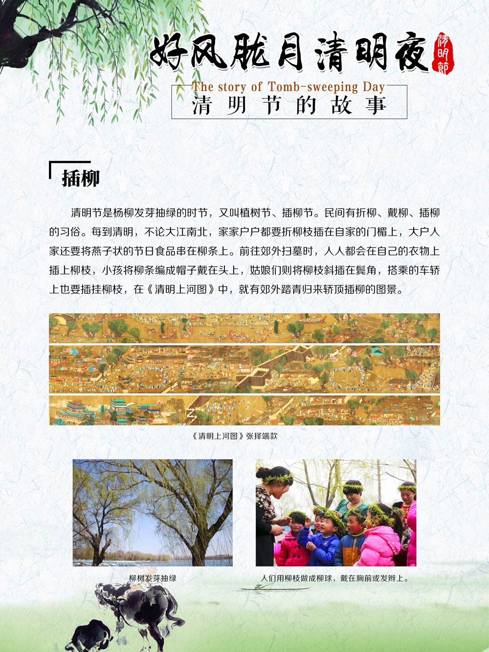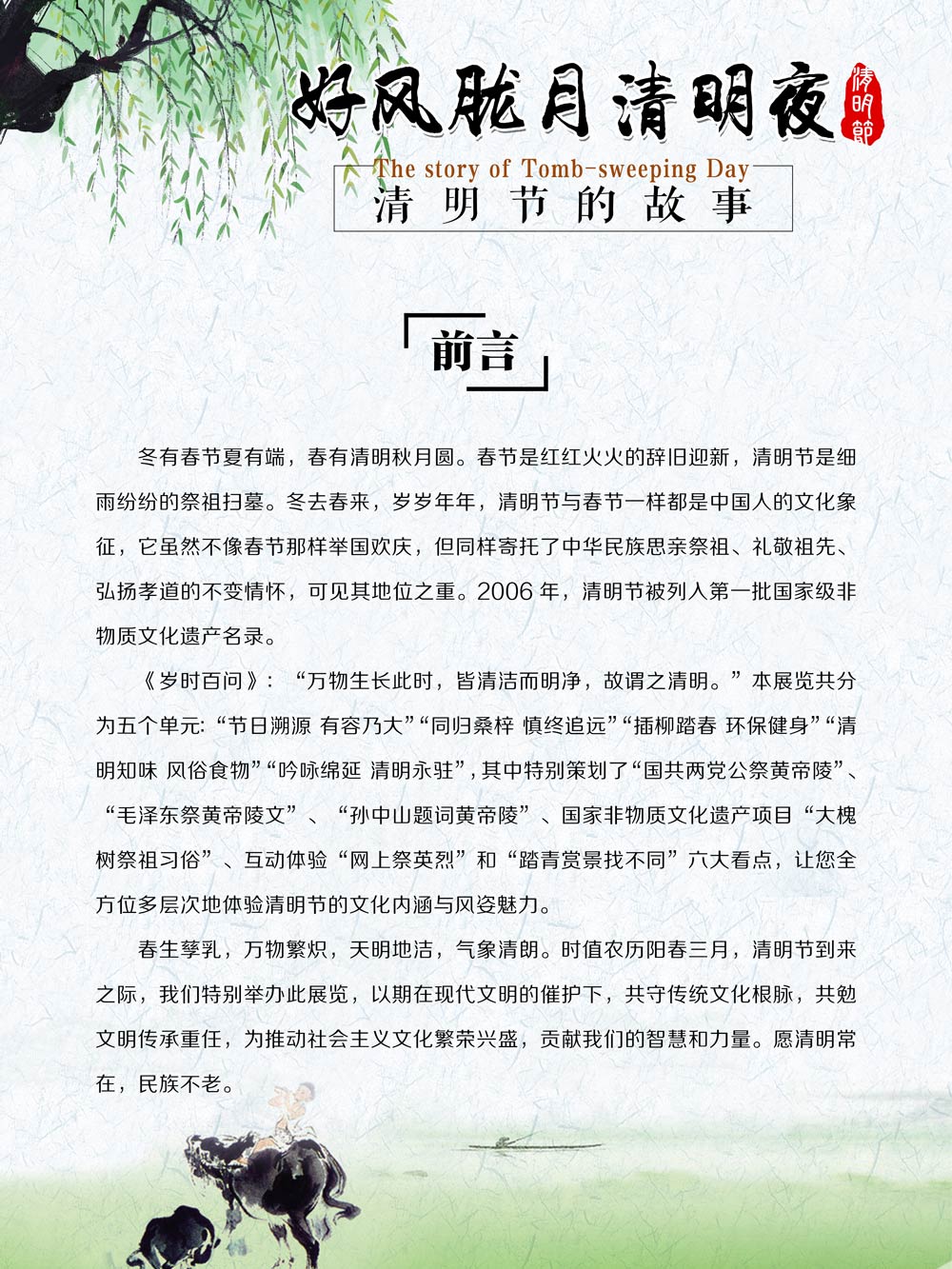 《好风胧月清明夜——清明节的故事》主题展览共分为五个单元:“节日溯源 有容乃大”“同归桑梓 慎终追远”“插柳踏春 环保健身”“清明知味 风俗食物”“吟咏绵延 清明永驻”,其中特别策划了“国共两党公祭黄帝陵”、“毛泽东祭黄帝陵文”、“孙中山题词黄帝陵”、国家非物质文化遗产项目“大槐树祭祖习俗”、互动体验“网上祭英烈”和“踏青赏景找不同”六大看点,让您全方位多层次地体验清明节的文化内涵与风姿魅力。 春生孳乳,万物繁炽,天明地洁,气象清朗。时值农历阳春三月,清明节到来之际,我们特别举办此展览,以期在现代文明的催护下,共守传统文化根脉,共勉文明传承重任,为推动社会主义文化繁荣兴盛,贡献我们的智慧和力量。愿清明常在,民族不老。