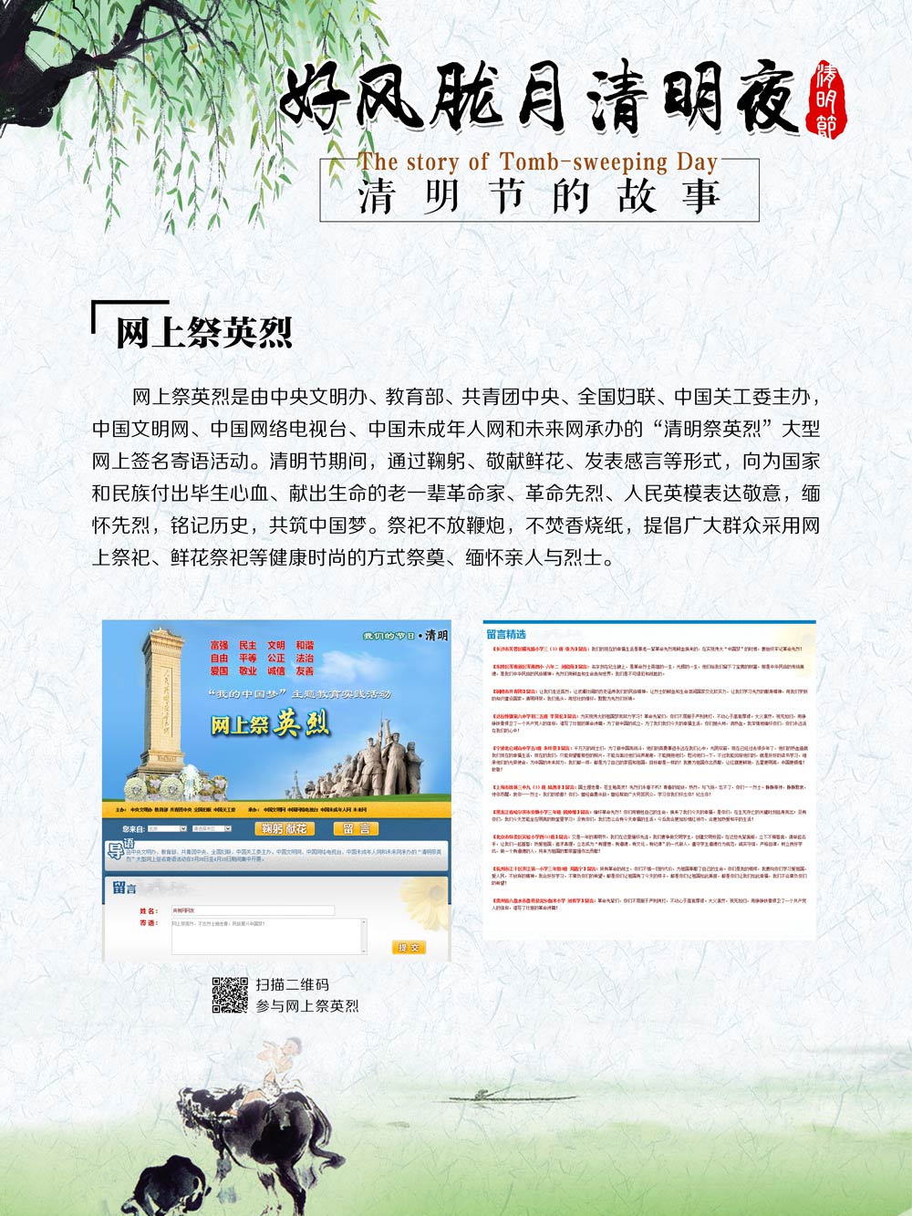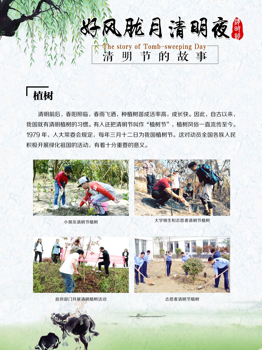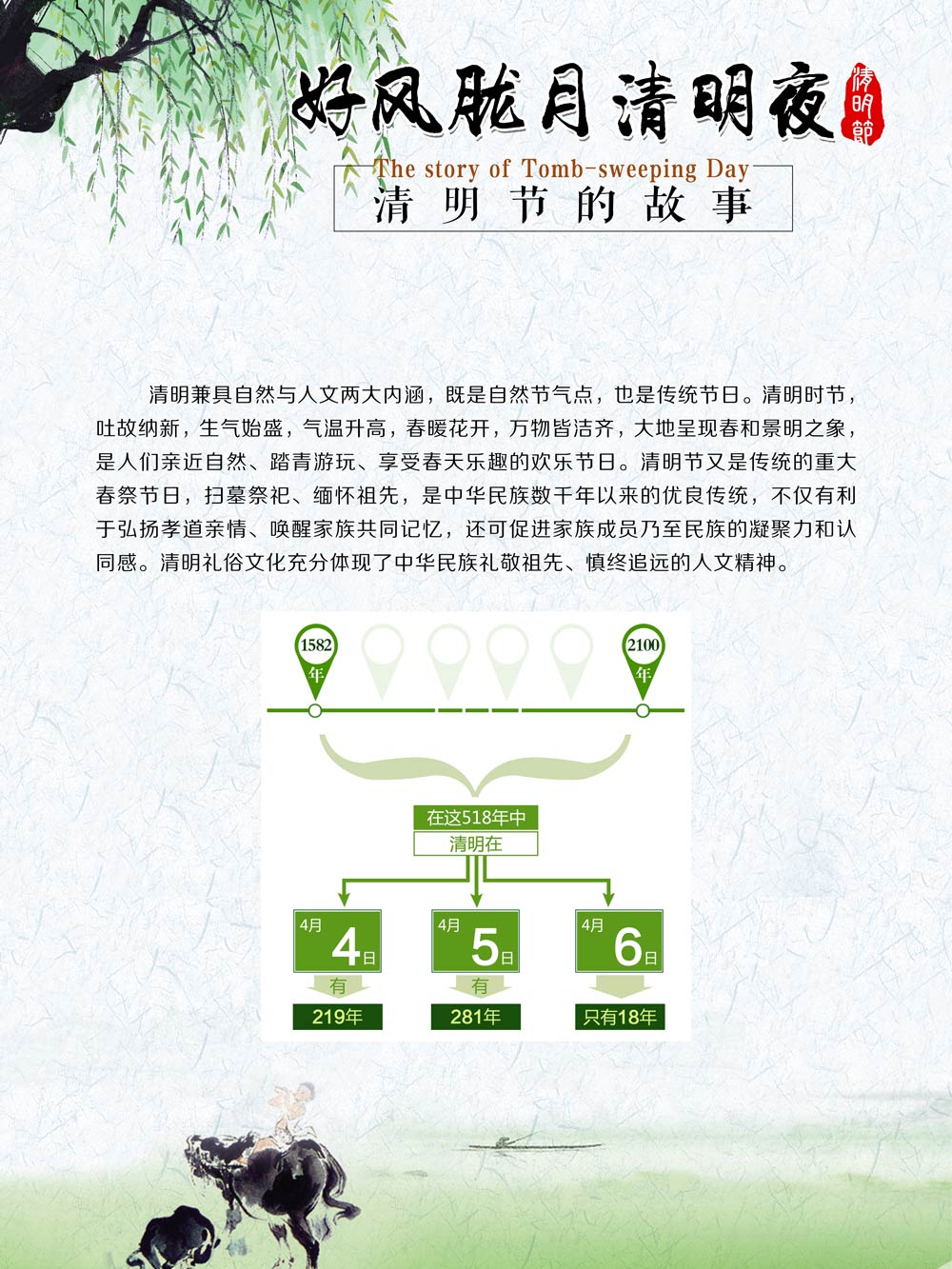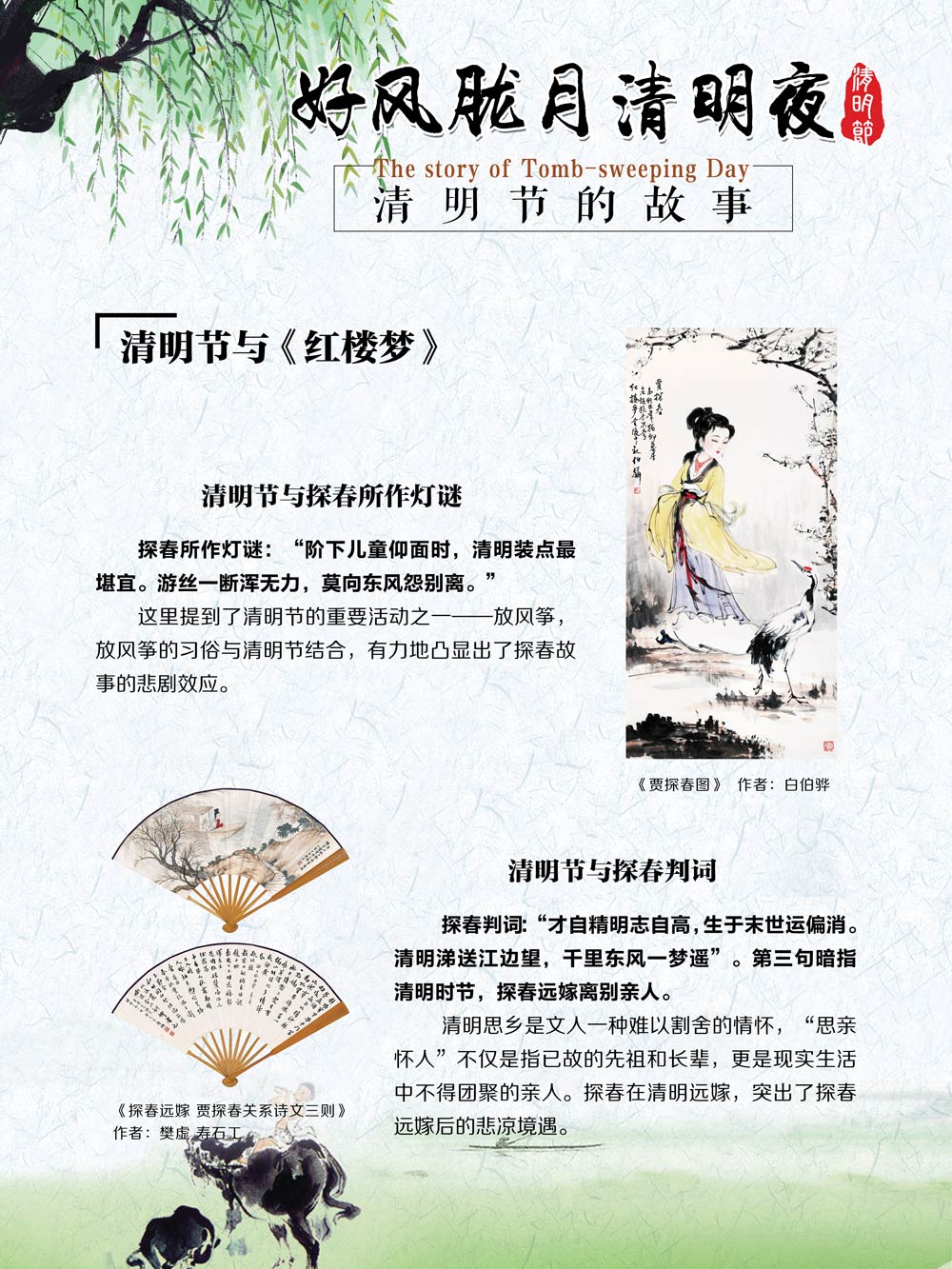 《好风胧月清明夜——清明节的故事》主题展览共分为五个单元:“节日溯源 有容乃大”“同归桑梓 慎终追远”“插柳踏春 环保健身”“清明知味 风俗食物”“吟咏绵延 清明永驻”,其中特别策划了“国共两党公祭黄帝陵”、“毛泽东祭黄帝陵文”、“孙中山题词黄帝陵”、国家非物质文化遗产项目“大槐树祭祖习俗”、互动体验“网上祭英烈”和“踏青赏景找不同”六大看点,让您全方位多层次地体验清明节的文化内涵与风姿魅力。 春生孳乳,万物繁炽,天明地洁,气象清朗。时值农历阳春三月,清明节到来之际,我们特别举办此展览,以期在现代文明的催护下,共守传统文化根脉,共勉文明传承重任,为推动社会主义文化繁荣兴盛,贡献我们的智慧和力量。愿清明常在,民族不老。