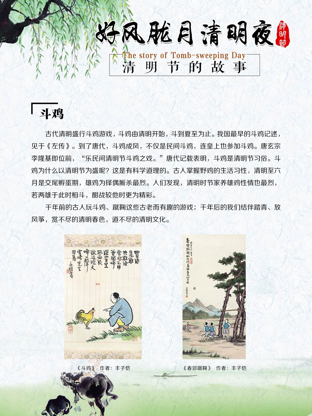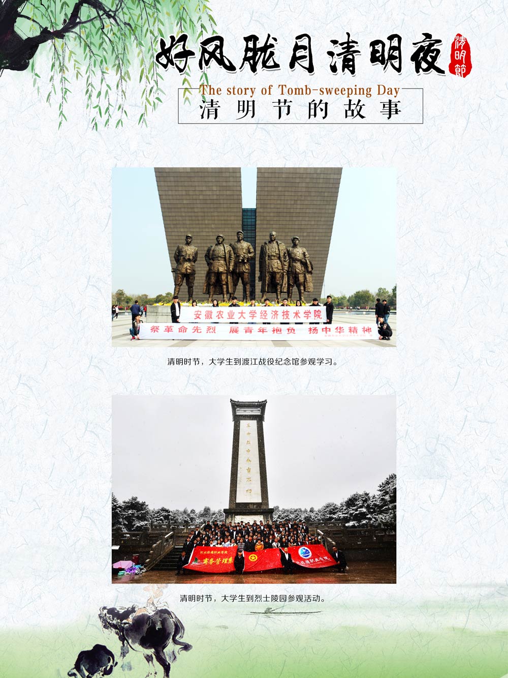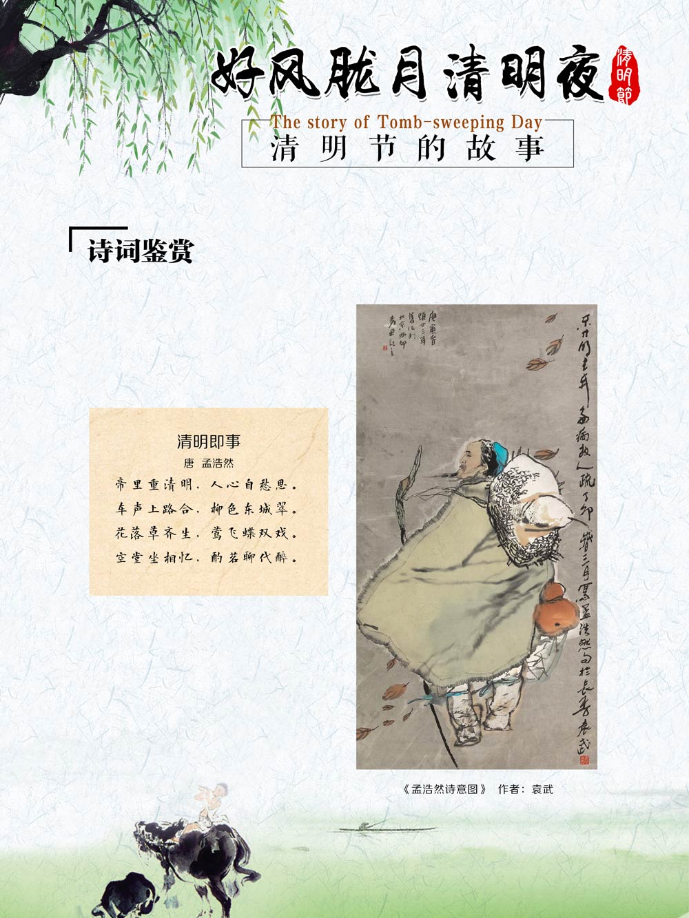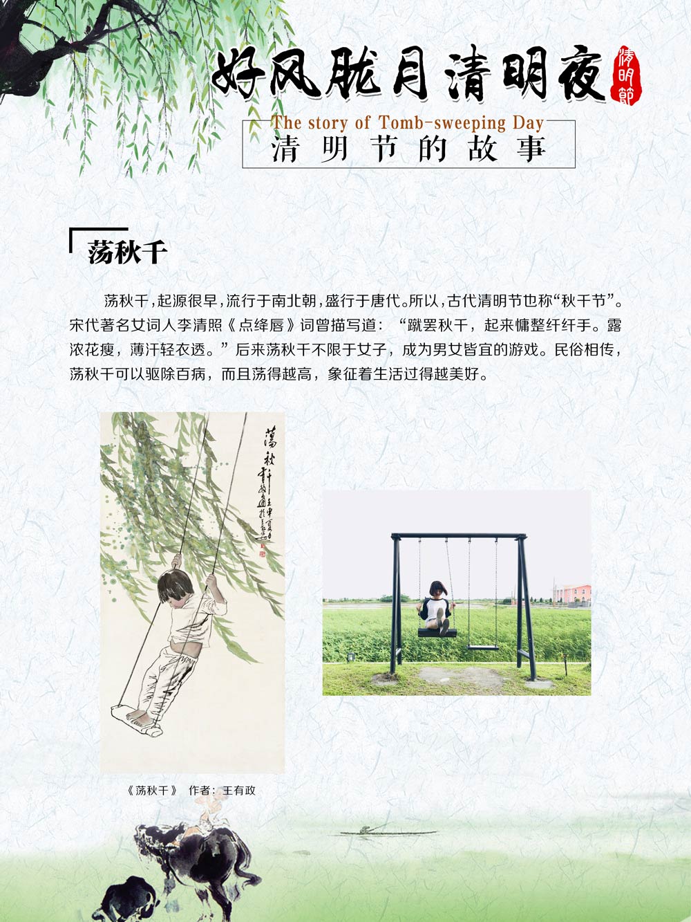 《好风胧月清明夜——清明节的故事》主题展览共分为五个单元:“节日溯源 有容乃大”“同归桑梓 慎终追远”“插柳踏春 环保健身”“清明知味 风俗食物”“吟咏绵延 清明永驻”,其中特别策划了“国共两党公祭黄帝陵”、“毛泽东祭黄帝陵文”、“孙中山题词黄帝陵”、国家非物质文化遗产项目“大槐树祭祖习俗”、互动体验“网上祭英烈”和“踏青赏景找不同”六大看点,让您全方位多层次地体验清明节的文化内涵与风姿魅力。 春生孳乳,万物繁炽,天明地洁,气象清朗。时值农历阳春三月,清明节到来之际,我们特别举办此展览,以期在现代文明的催护下,共守传统文化根脉,共勉文明传承重任,为推动社会主义文化繁荣兴盛,贡献我们的智慧和力量。愿清明常在,民族不老。
