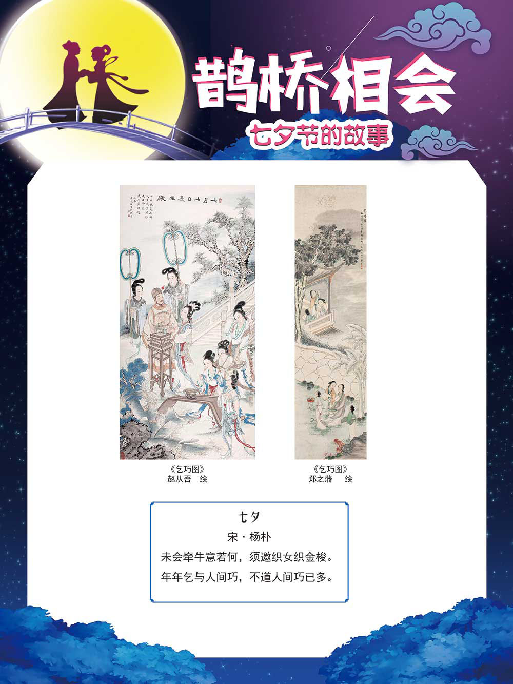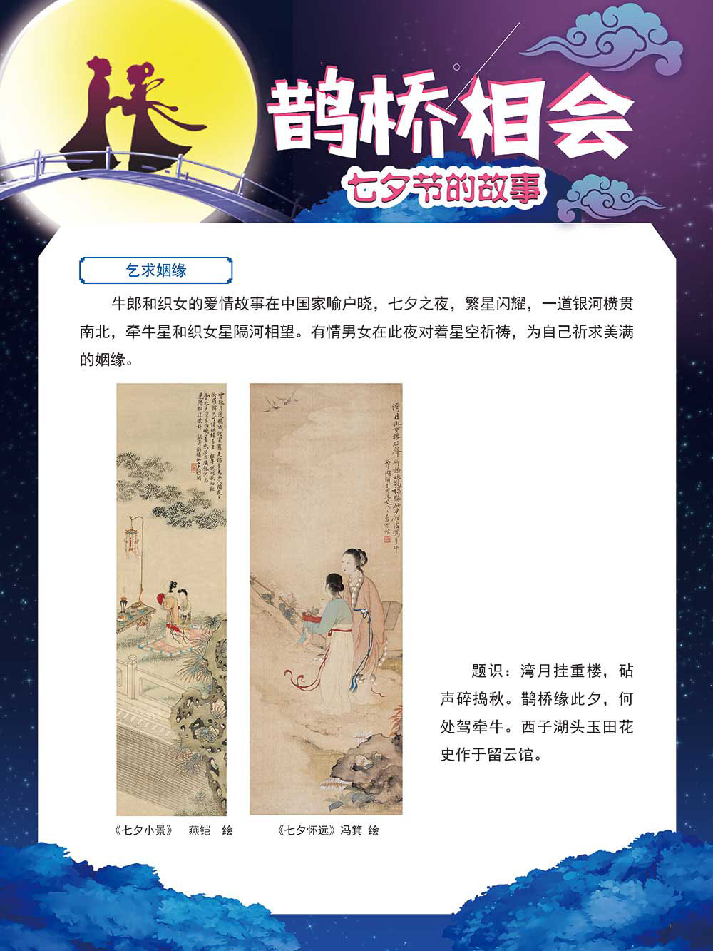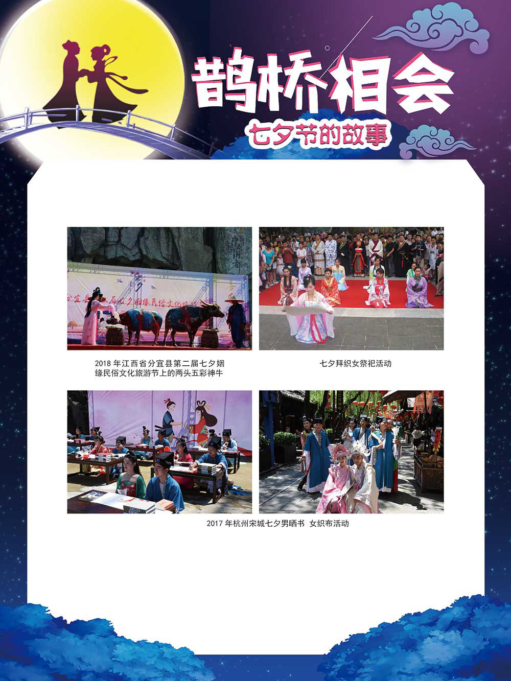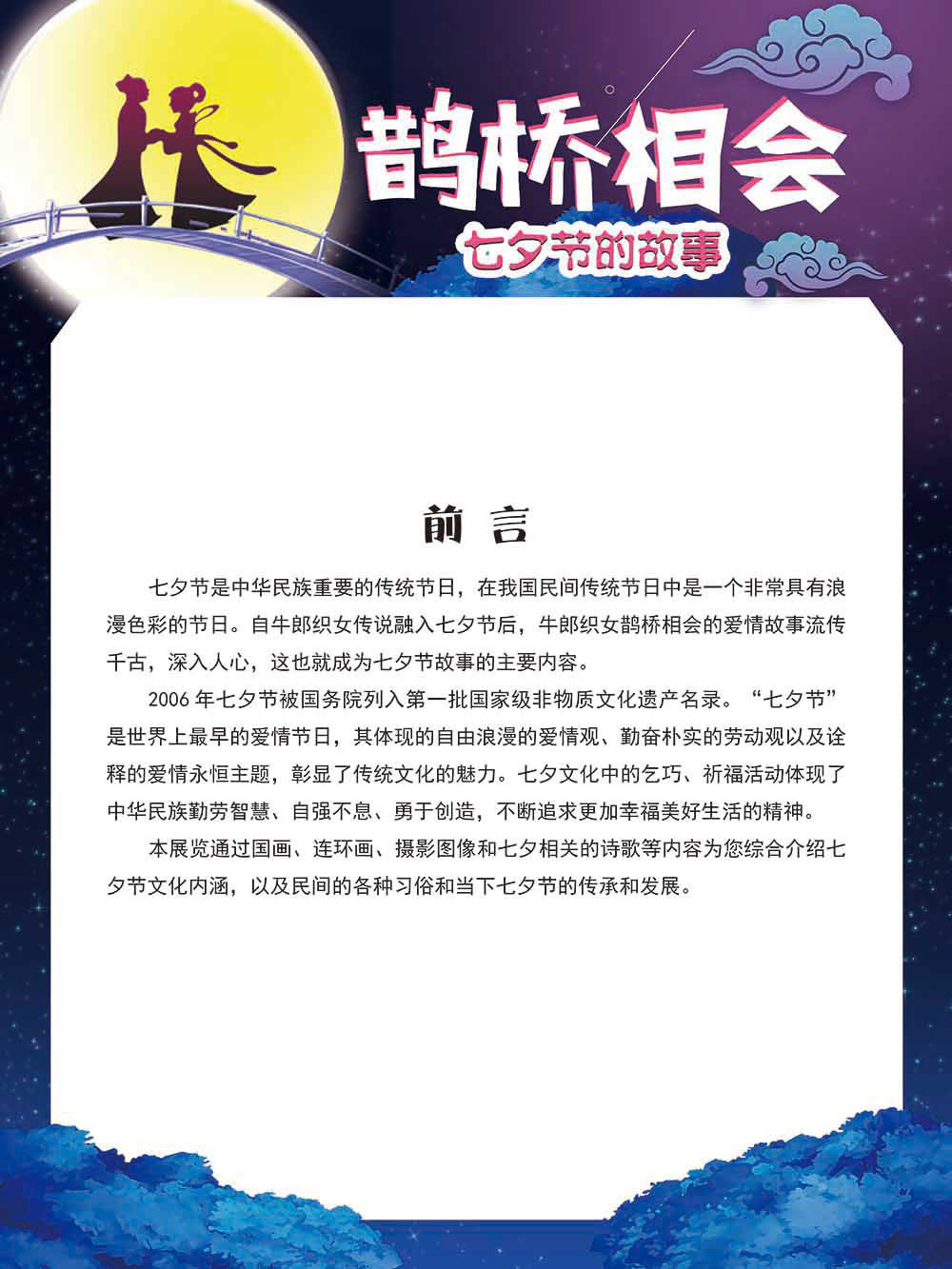 七夕节是中华民族重要的传统节日,在我国民间传统节日中是一个非常具有浪漫色彩的节日。自牛郎织女传说融入七夕节后,牛郎织女鹊桥相会的爱情故事流传千古,深入人心,这也就成为七夕节的主要内容。 2006年七夕节被国务院列入第一批国家级非物质文化遗产名录。“七夕节”是世界上最早的爱情节日,其体现的自由浪漫的爱情观、勤奋朴实的劳动观以及诠释的爱情永恒主题,彰显了传统文化的魅力。七夕文化中的乞巧、祈福活动体现了中华民族勤劳智慧、自强不息、勇于创造,不断追求更加幸福美好生活的精神。 本展览通过国画、连环画、摄影图像和七夕相关的诗歌等内容为您综合介绍七夕节文化内涵,以及民间的各种习俗和当下七夕节的传承和发展。