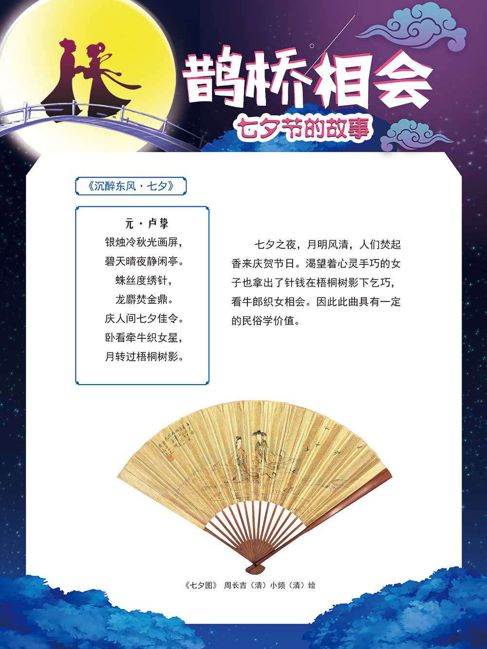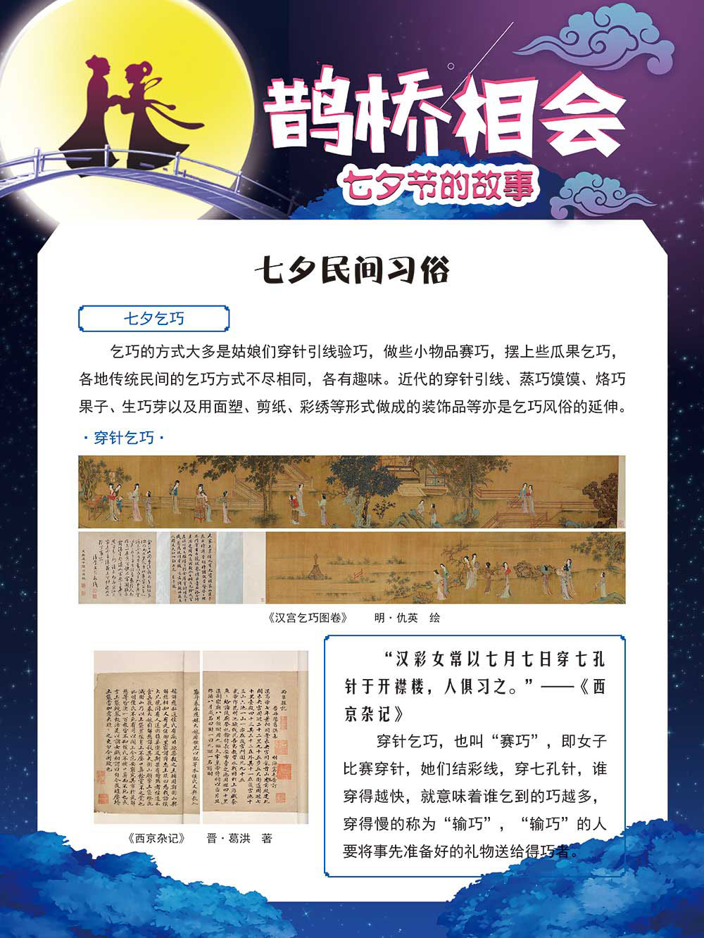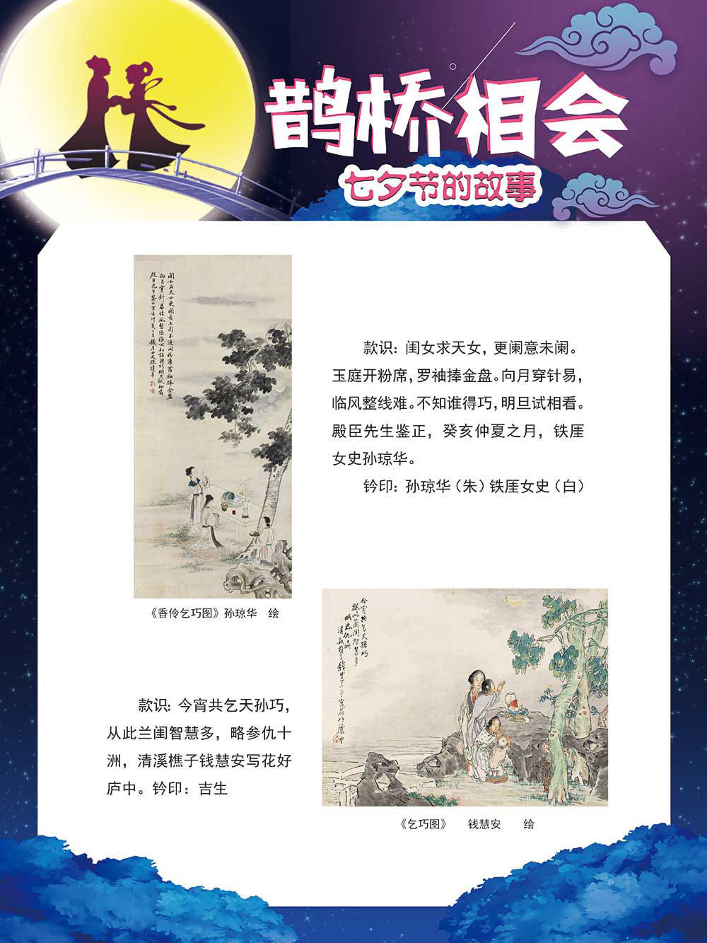 七夕节是中华民族重要的传统节日,在我国民间传统节日中是一个非常具有浪漫色彩的节日。自牛郎织女传说融入七夕节后,牛郎织女鹊桥相会的爱情故事流传千古,深入人心,这也就成为七夕节的主要内容。 2006年七夕节被国务院列入第一批国家级非物质文化遗产名录。“七夕节”是世界上最早的爱情节日,其体现的自由浪漫的爱情观、勤奋朴实的劳动观以及诠释的爱情永恒主题,彰显了传统文化的魅力。七夕文化中的乞巧、祈福活动体现了中华民族勤劳智慧、自强不息、勇于创造,不断追求更加幸福美好生活的精神。 本展览通过国画、连环画、摄影图像和七夕相关的诗歌等内容为您综合介绍七夕节文化内涵,以及民间的各种习俗和当下七夕节的传承和发展。