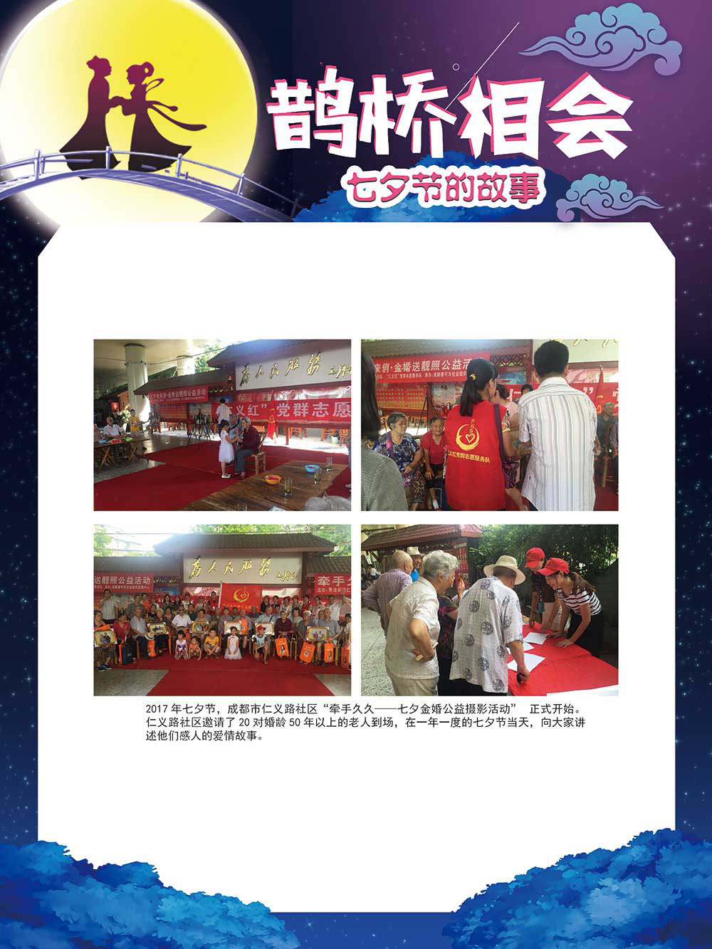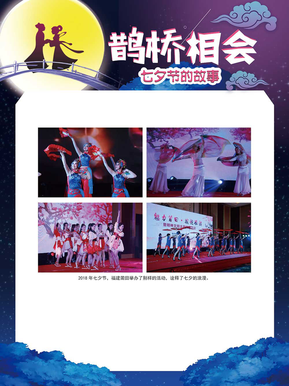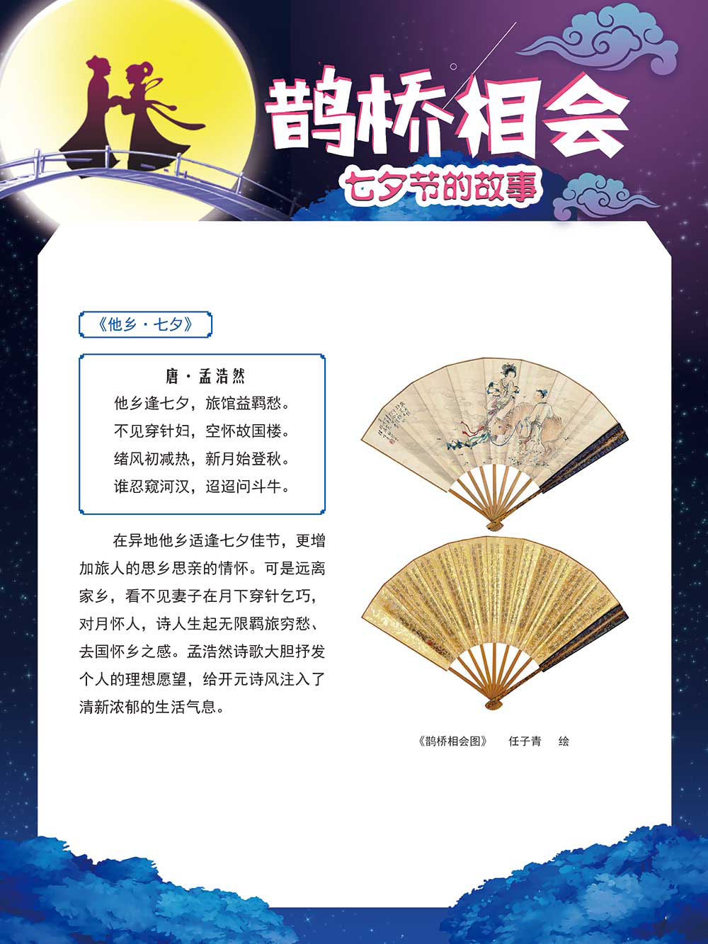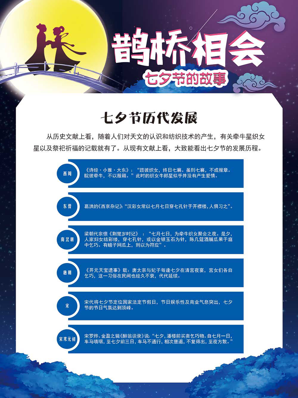 七夕节是中华民族重要的传统节日,在我国民间传统节日中是一个非常具有浪漫色彩的节日。自牛郎织女传说融入七夕节后,牛郎织女鹊桥相会的爱情故事流传千古,深入人心,这也就成为七夕节的主要内容。 2006年七夕节被国务院列入第一批国家级非物质文化遗产名录。“七夕节”是世界上最早的爱情节日,其体现的自由浪漫的爱情观、勤奋朴实的劳动观以及诠释的爱情永恒主题,彰显了传统文化的魅力。七夕文化中的乞巧、祈福活动体现了中华民族勤劳智慧、自强不息、勇于创造,不断追求更加幸福美好生活的精神。 本展览通过国画、连环画、摄影图像和七夕相关的诗歌等内容为您综合介绍七夕节文化内涵,以及民间的各种习俗和当下七夕节的传承和发展。