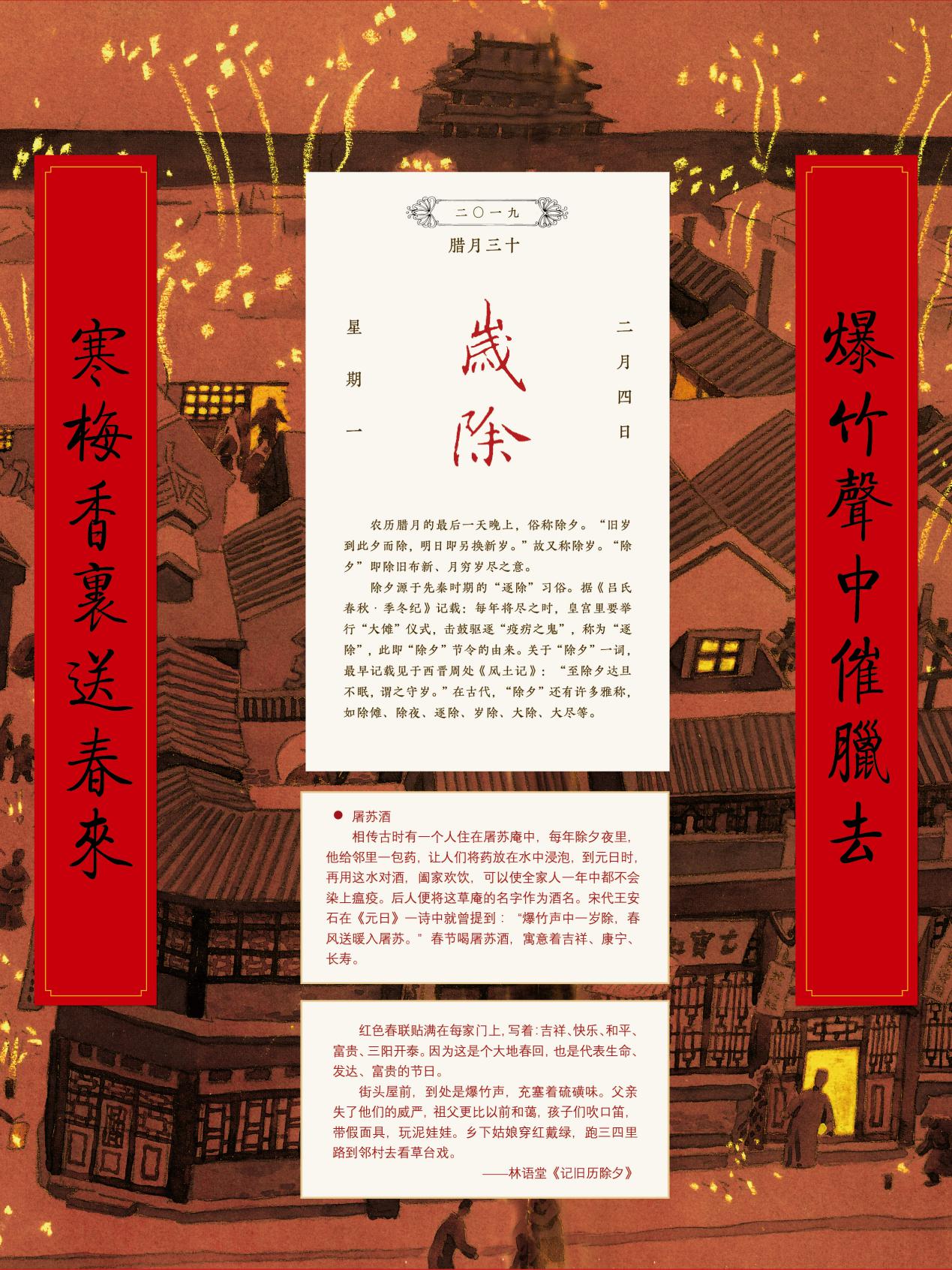 春节是中华民族最隆重、最盛大、最丰富的传统节日,民谚所谓“百节年为首”。自从岁时确立,中国人便有了过年的习俗,并代代传承至今。“千门万户瞳瞳日, 总把新桃换旧符”,贴春联、放鞭炮、包饺子、闹元宵等过年习俗历经千百年的浸染,承载着一代代的民族记忆, 形成了庞大、厚重的年俗文化,为我们留下了一份珍贵的民族文化遗产。 中华文明源远流长、博大精深,年俗文化跨越千年、绵延至今,皆离不开浩如烟海之卷册的承载。让我们从浩瀚的典籍中窥得年节习俗的传承与流变,重温扎根于心底的年味印记。 告别戊戌,时值己亥新年,我们特举办本次展览,在馥郁的书香中共品中华之年俗,共勉传承之重任,以期在浓浓的书香年中传承文化根脉,同圆中国梦想。