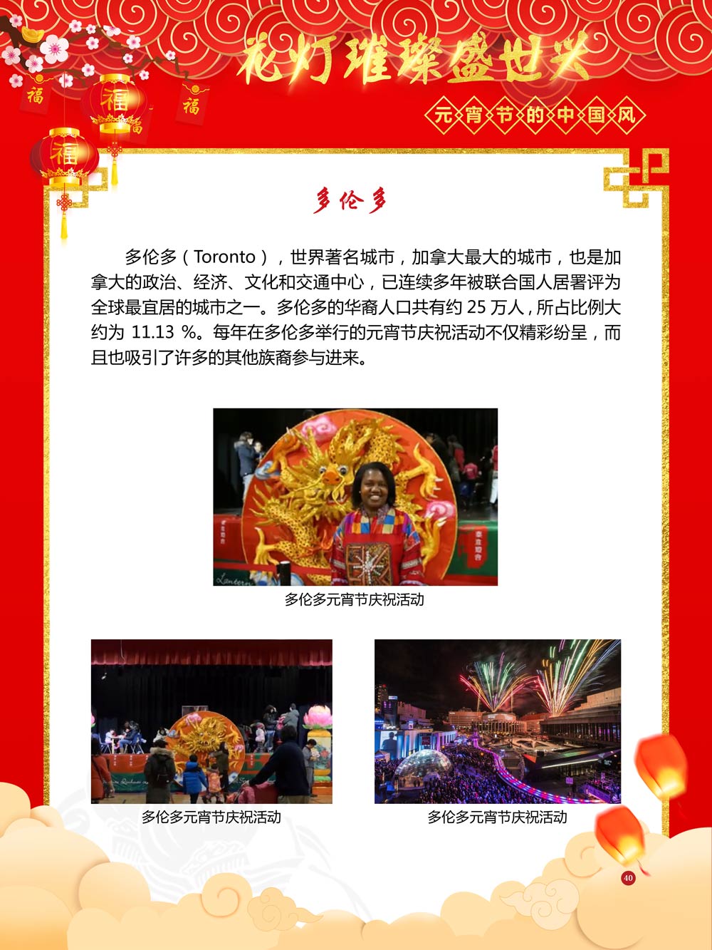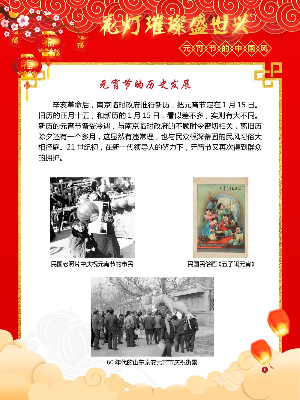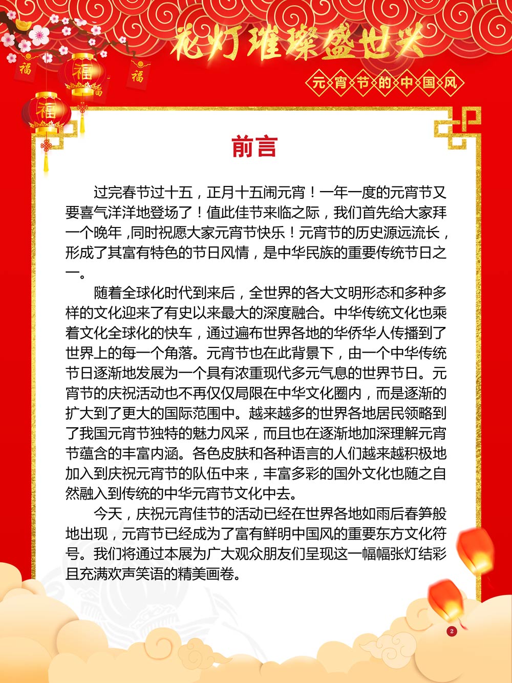 过完春节过十五,正月十五闹元宵!一年一度的元宵节又要喜气洋洋的登场了!值此佳节来临之际,我们首先给大家拜一个晚年,同时祝愿大家元宵节快乐!元宵节的历史源远流长,形成了其富有特色的节日风情,是中华民族的重要传统节日之一。 随着全球化时代到来后,全世界的各大文明形态和多种多样的文化迎来了有史以来最大的深度融合。中华传统文化也乘着文化全球化的快车,通过遍布世界各地的华侨华人传播到了世界上的每一个角落。元宵节也在此背景下,由一个中华传统节日逐渐的发展为一个具有浓重现代多元气息的世界节日。元宵节的庆祝活动也不在仅仅局限在中华文化圈内,而是逐渐地扩大到了更大的国际范围中。越来越多的世界各地居民领略到了我国元宵节独特的魅力风采,而且也在逐渐地加深理解元宵节蕴含的丰富内涵。各色皮肤和各种语言的人们越来越积极地加入到庆祝元宵节的队伍中来,丰富多彩的国外文化也随之自然融入到传统的中华元宵节文化中去。 今天,庆祝元宵佳节的活动已经在世界各地如雨后春笋般出现,元宵节已经成为了富有鲜明中国风的重要东方文化符号。我们将通过本展为广大观众朋友们呈现这一幅幅张灯结彩且充满欢声笑语的精美画卷。