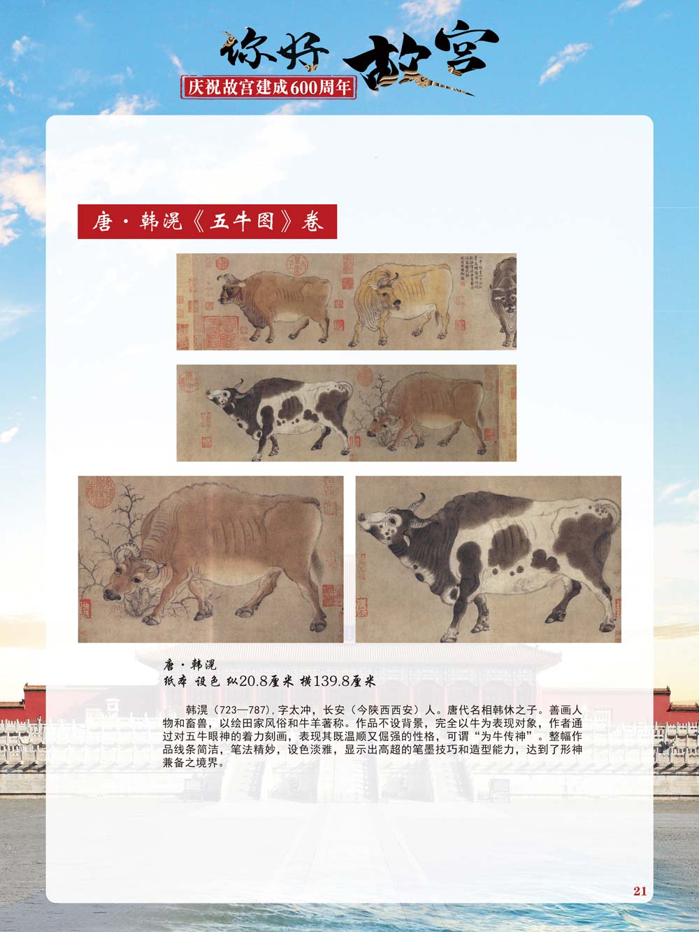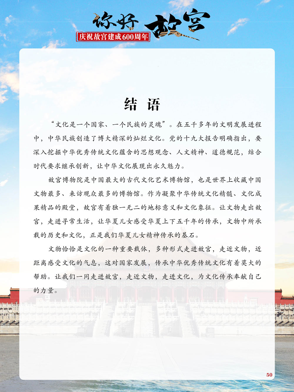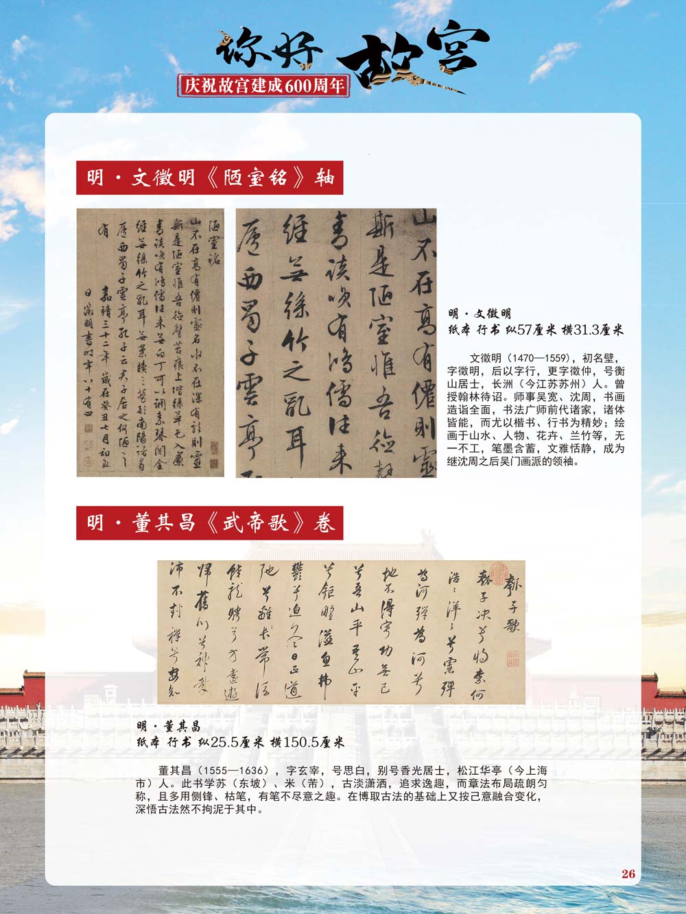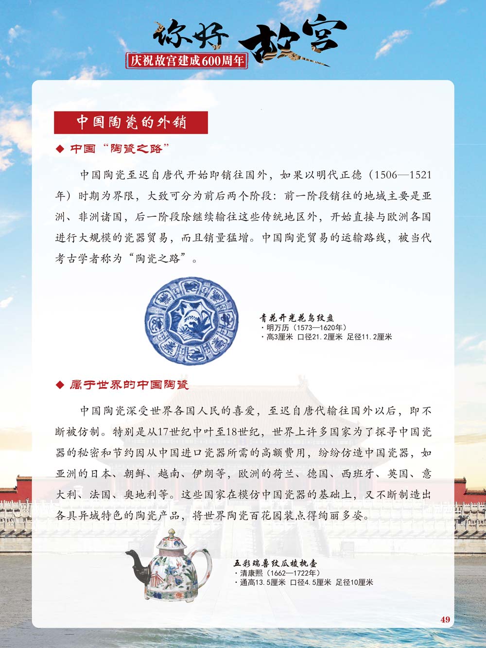 故宫是了解中国历史文化不可或缺的窗口。它其实有两个名字,一个名叫故宫博物院,90多岁了;一个名叫紫禁城,今年整整600岁了。 历史文物承载着一个民族的灿烂文明,本展览立足于故宫建成600周年,通过介绍故宫的建筑、字画、陶瓷,让观众不仅可以欣赏精美的文物,还可以在历史的氛围中徜徉传承和发扬中华优秀传统文化。故宫的每一座宫殿建筑、朱漆大门、院落桥梁、青砖黄瓦、宫廷陈设、梁枋彩画,承载着丰富的历史符号、文化内涵。书画藏品是故宫博物院艺术藏品的重中之重,阎立本《步辇图》,张择端《清明上河图》,王羲之、欧阳询等名家书法成为故宫镇院之宝。陶瓷,是文明的象征,每件作品背后的文化因素,让造型、釉色和装饰纹样呈现出丰富多元的面貌。陶瓷吸引人之处,在于它们呼应着源远流长的历史脉络,同时也反映出不同文化相互交流的现象。