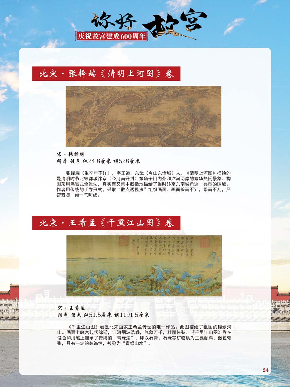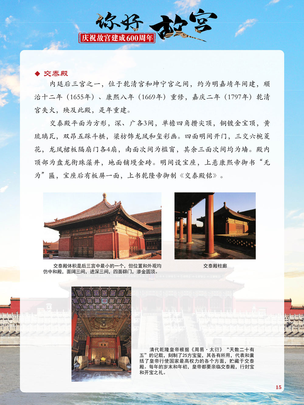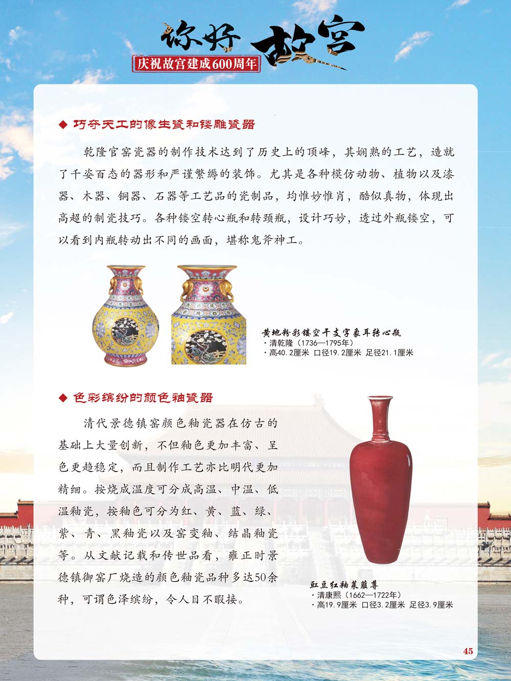 故宫是了解中国历史文化不可或缺的窗口。它其实有两个名字,一个名叫故宫博物院,90多岁了;一个名叫紫禁城,今年整整600岁了。 历史文物承载着一个民族的灿烂文明,本展览立足于故宫建成600周年,通过介绍故宫的建筑、字画、陶瓷,让观众不仅可以欣赏精美的文物,还可以在历史的氛围中徜徉传承和发扬中华优秀传统文化。故宫的每一座宫殿建筑、朱漆大门、院落桥梁、青砖黄瓦、宫廷陈设、梁枋彩画,承载着丰富的历史符号、文化内涵。书画藏品是故宫博物院艺术藏品的重中之重,阎立本《步辇图》,张择端《清明上河图》,王羲之、欧阳询等名家书法成为故宫镇院之宝。陶瓷,是文明的象征,每件作品背后的文化因素,让造型、釉色和装饰纹样呈现出丰富多元的面貌。陶瓷吸引人之处,在于它们呼应着源远流长的历史脉络,同时也反映出不同文化相互交流的现象。