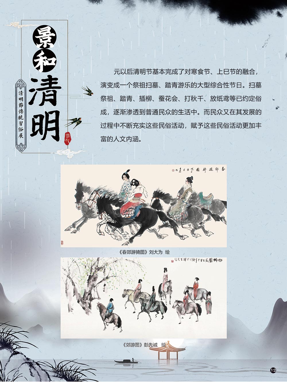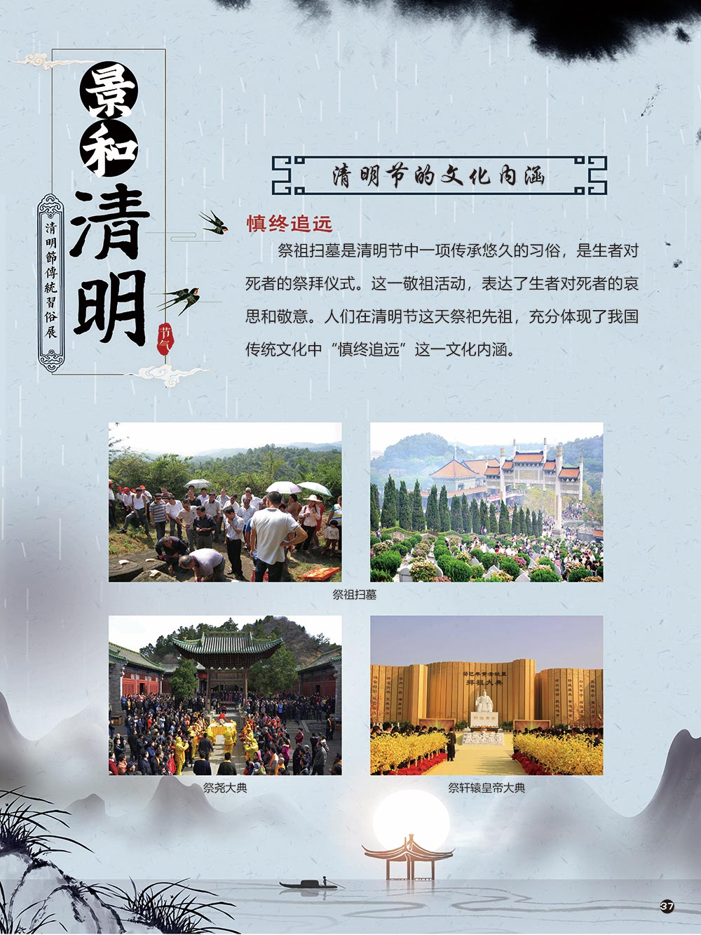 清明节是中华民族传统节日中一个由节气命名的节日。清明节的文化内涵传承着中华民族独特的精神与情感。古往今来,清明节作为中国忠孝文化的载体,对家庭的尊崇,对祖先的感恩,对血脉责任的认同,使其在我国民俗节日体系中具有不可替代的地位。 清明节蕴含着我国优秀的民族文化,承载着我国民众的伦理观念、审美情趣、道德信仰和社会风俗。 在上千年的历史发展中,清明节这一古老的传统节日,随时代而变化。尤其是在当今社会,清明节的发展呈现出新态势。如政府组织学校或单位在清明节去革命烈士陵园扫墓,缅怀为新中国浴血奋战的革命先烈;数以万计的海外侨胞在清明节回国,祭拜人类始祖轩辕黄帝。 2006年5月20日,文化部申报的清明节经国务院批准列入第一批国家级非物质文化遗产名录。清明节习俗甚多,全国各地因地域文化不同而又存在着习俗内容上或细节上的差异,各地习俗虽不尽相同,但扫墓祭祖、踏青郊游是共同的基本节俗主题。展览主要介绍清明节的起源及发展和习俗文化,以此讲述清明节日故事,弘扬传统文化。