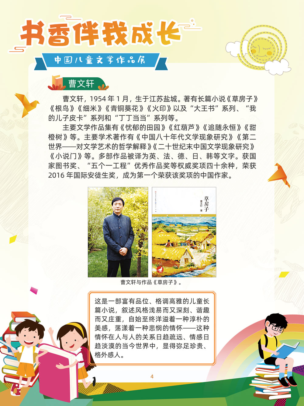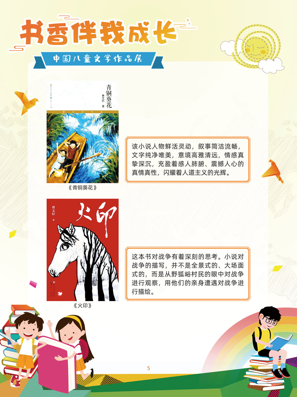 人之初,性本善。儿童文学是人生最早接受的文学。那些曾经深深感动过少年儿童的作品,将使人终身难忘,终生受惠。在今天这个传媒多元的时代,我们特别需要向广大少年儿童提倡文学阅读。 对孩子来说,一本好书,在带给他们欢笑与感动的同时,也可以帮助他们搭建起一个丰富多彩的心灵世界,以文字为窗口,孩子们可以凭窗远眺,放眼望去,皆是瑰丽多姿的世间万物。 以童趣笔调,描孩子的天真生活,以新颖视角,投射孩子的奇妙想象,在这些趣味盎然的书籍里,我们陪伴孩子一起阅读思考,探索认识这个世界的温柔与善良。 在“六一”儿童节到来之际,此次展览将最好的儿童文学作品介绍给广大少年儿童通过介绍荣获国际安徒生奖、国家图书奖、宋庆龄儿童文学奖、冰心儿童文学新作奖、陈伯吹国际儿童文学奖、全国儿童文学奖的部分优秀获奖作品,让孩子们通过阅读,赏和领略不同文学大师的风格,感受各种儿童文学大奖作品的魅力,寻找记忆深处的纯真,也让这些儿童文化作品点亮孩子们的梦想。