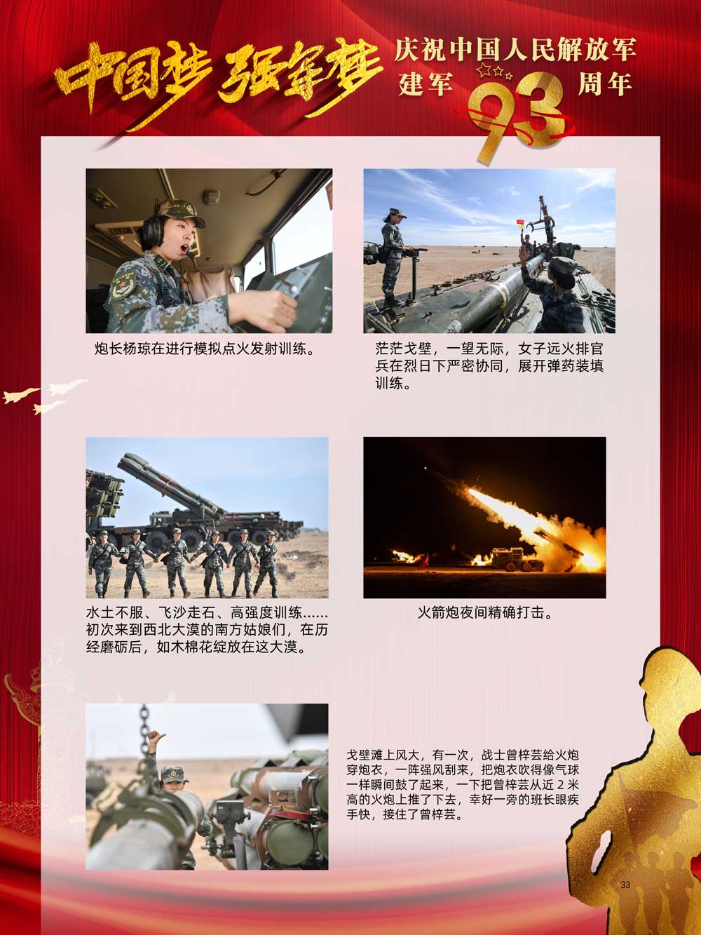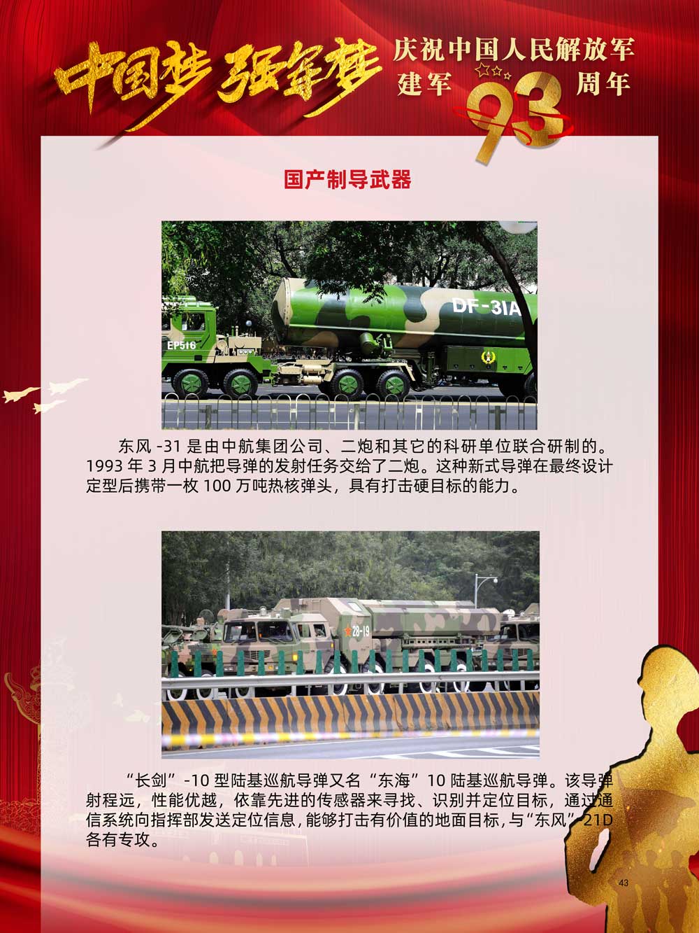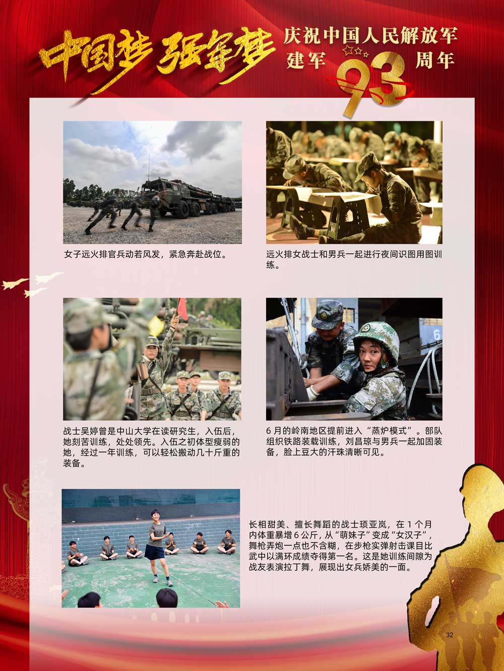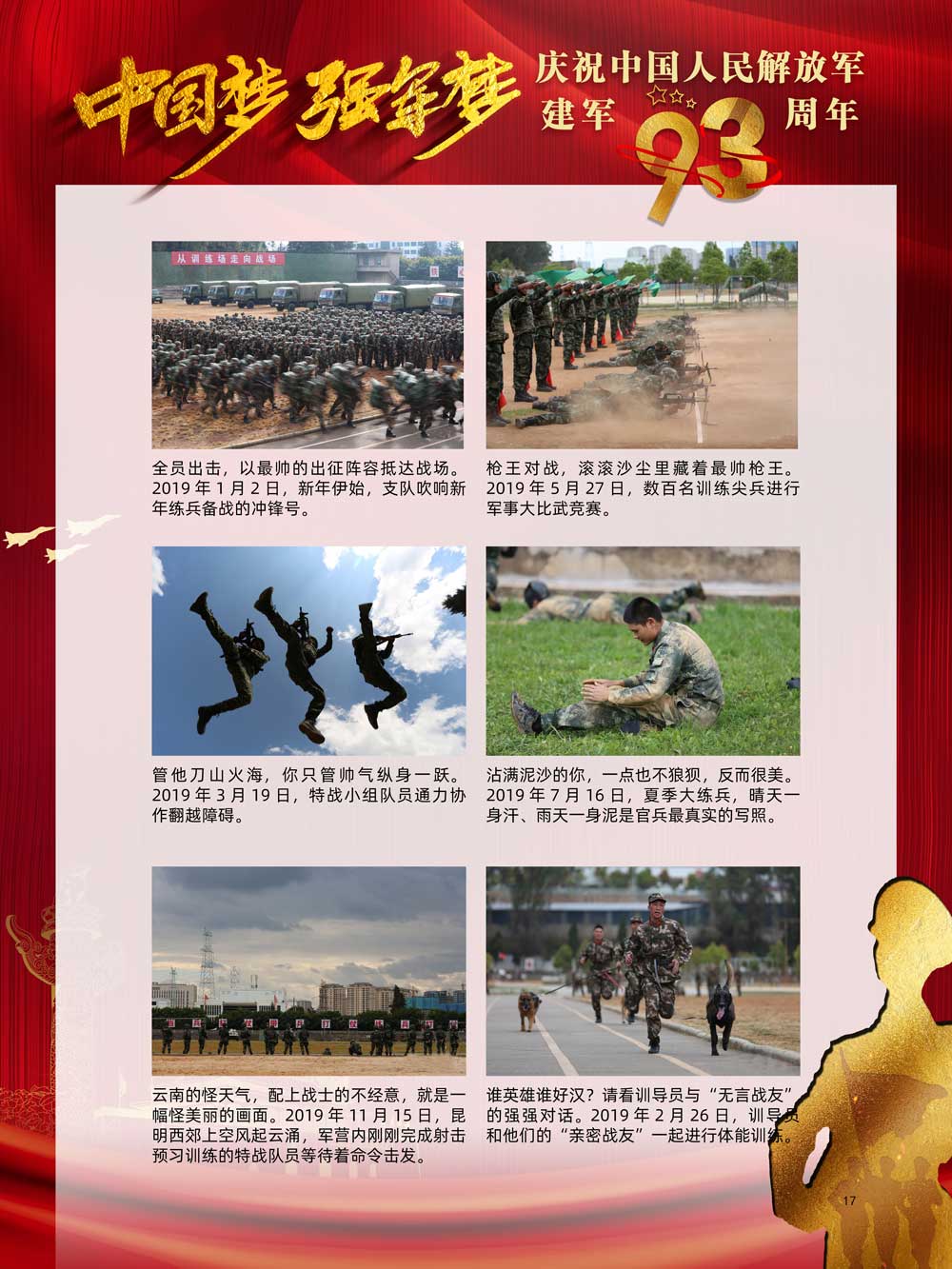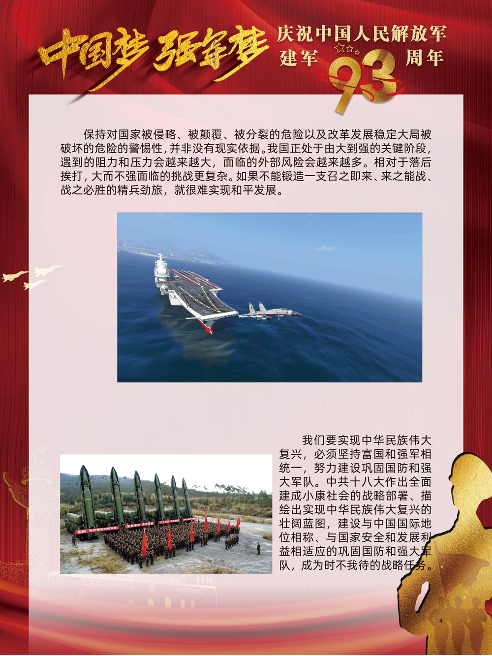 中国梦,强军梦。同根生,同心圆。 在十九大报告中有一句重要的表述,实现中国梦强军梦,把中国梦和强军梦放在一起表述和推进。在新时代国家安全形势面临着复杂严峻的局面,我们要实现中华民族伟大复兴的中国梦,对安全需求、安全保障提出了更高的要求。在这样一个背景下,建设强大军队的历史任务就前所未有地提出了。 中国梦和强军梦,是相互支持、相互支撑的关系。中国梦为强军梦提供强大的支撑,因为我们国家如果不能富强,我们就不可能有足够的资源来用于国防和军队建设。所以建设一支强大的军队必须要以中国梦的实现、要以国家的富强来作为前提,只有“富国强军”,中国梦最终才能实现。强军是中华民族伟大复兴的重要基石。富国和强军是中华民族伟大复兴的两大基石。富国是强军的基本依托,强军是富国的安全保障。强军梦不圆,中国梦也难圆。雄厚的经济实力是一个国家强大的基础,但倘若没有相应的国防实力和军事能力作后盾,经济实力再强大也不能成就真正意义上的中国梦。 今年是中国人民解放军建军93年,为庆祝中国人民解放军建军93周年,我们特别策划本展览,向您介绍中国梦强军梦的理论关系,介绍习近平强军的思想,向您展示中国人民解放军刻苦训练的飒爽英姿和自主创新的国产武器,以及其乐融融的军民鱼水情。