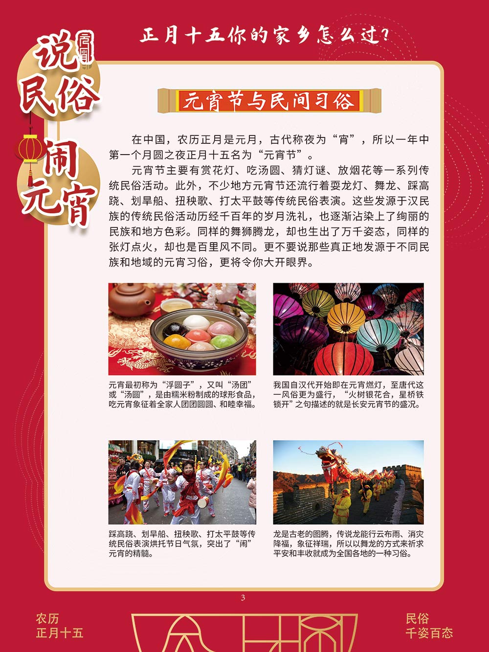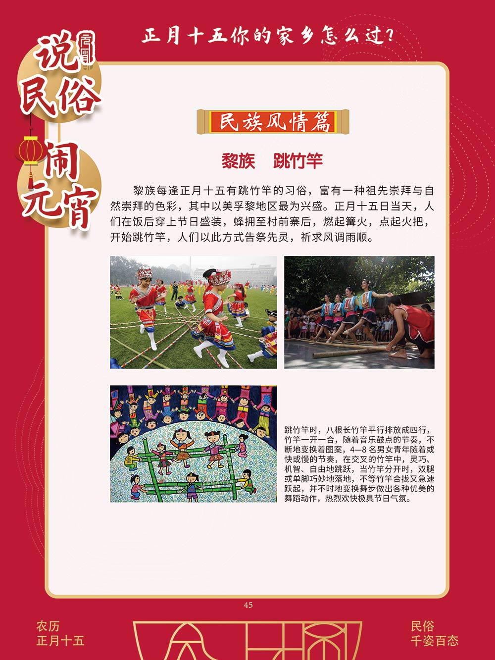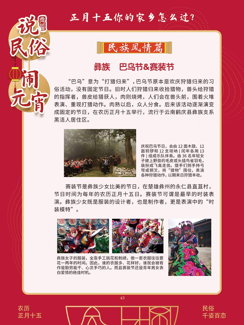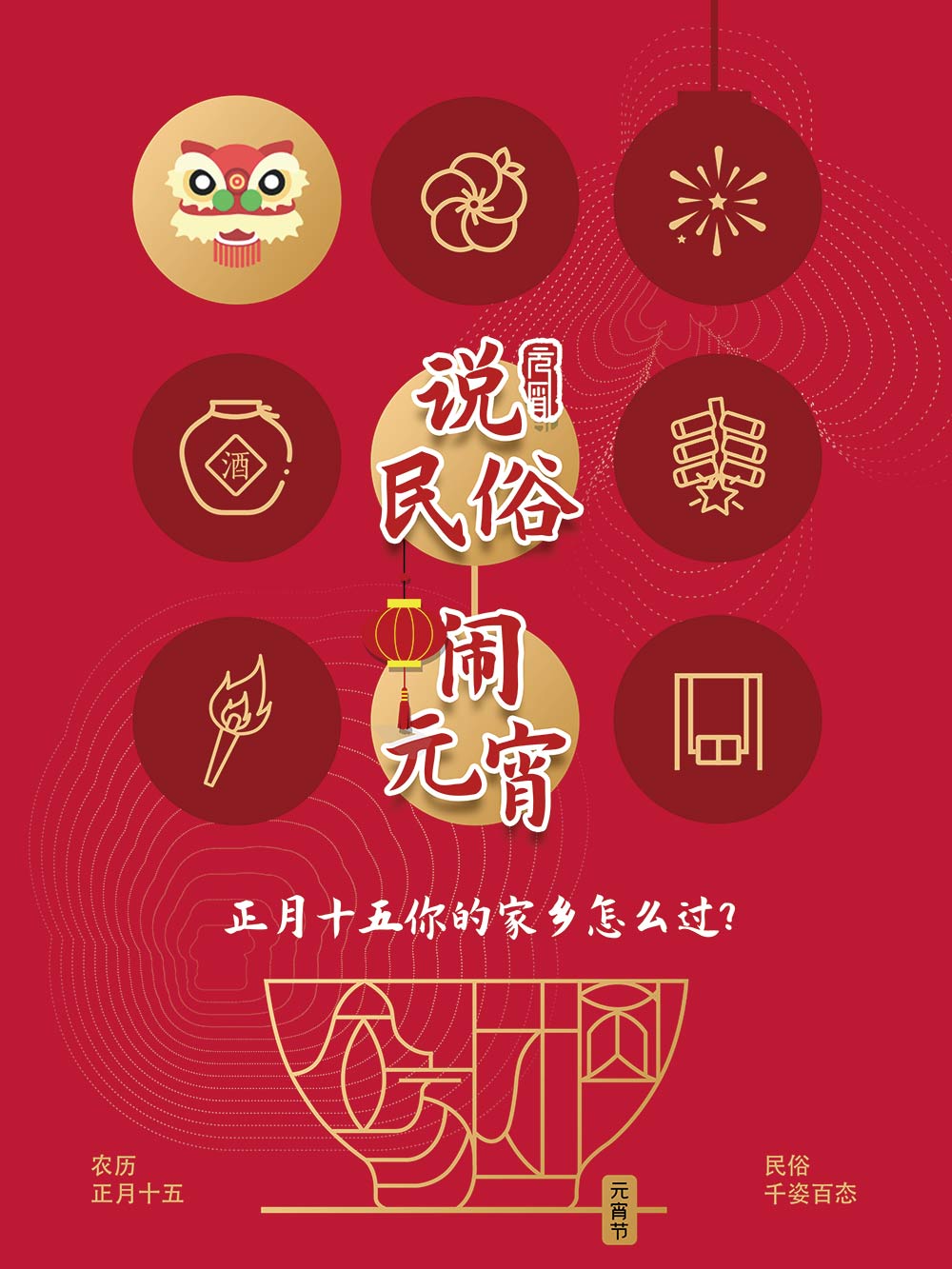 每年的正月十五这一天,赏花灯、猜灯谜、吃元宵、放烟花、耍龙灯、舞狮子、踩高跷、划旱船……这些衍生于汉民族传统习俗的节日活动接连上演,随处可见一派欢天喜地、热闹非凡。然而在幅员辽阔、地广物博的中华大地上,不同的民族和地域也形成了许多独具特色的元宵节习俗,其中很多都已被列为国家级非物质文化遗产。 这些从农耕文明孕育而来的岁时节俗,千百年来,孕育和滋养了博大而丰富的中国传统文化。它们经历了千百年漫长而复杂的发展变迁、代代相传,凝聚了中国劳动人民的智慧结晶,闪烁着中华民族的文明之光。 在西方节日流行的当下,我们对这些中华民族的灿烂民俗文化瑰宝又了解多少呢?是时候让灿烂的民俗真正“闹”起来,让传统节日融入当下的大众生活,在保留原有文化底蕴的基础上,从内容和形式上注入更符合现代潮流的创新元素,唤回年轻人们的关注。 正月十五你的家乡怎么过?不妨借此元宵佳节之际,让我们一起来说民族闹元宵,比一比究竟哪里的年味最浓!